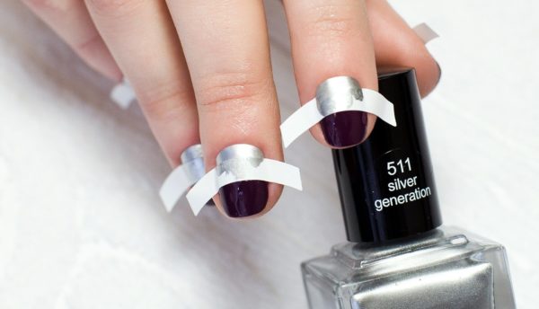 En utilisant du ruban adhésif, vous pouvez faire une manucure abstraite. Pour commencer, peignez les ongles de n'importe quelle couleur et dès que le revêtement sèche, collez le ruban adhésif coupé en bandes. Appliquez du vernis d'une couleur différente sur le dessus et retirez délicatement le ruban avec des pincettes.