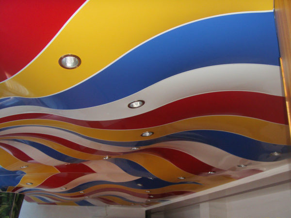 Un détail intérieur tel qu'un plafond suspendu de couleurs vives réduit non seulement visuellement la hauteur du plafond, mais c'est également une solution dépassée. Aujourd'hui, le plafond blanc standard, qui peut être équipé de petites lampes ou d'un lustre original, aura l'air le plus avantageux. Il aura l'air le plus élégant et le plus moderne.