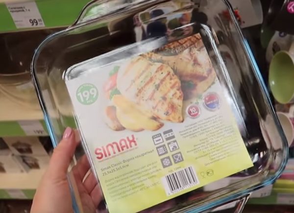 Un plat de cuisson carré, mesurant 25x25 cm, la hauteur des côtés - 5,5 cm.Il peut être utilisé à des températures allant jusqu'à +300 degrés.