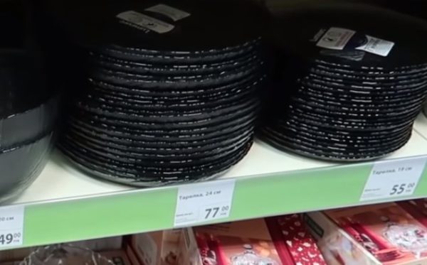 Une nouvelle série de plats noirs de la marque Luminarc a été mise en vente. Il convient de prêter attention aux assiettes à dîner, présentées en deux versions: avec un diamètre de 19 cm et même plus - 24 cm.Le prix des assiettes est de 55 roubles. et 77 roubles. en conséquence.