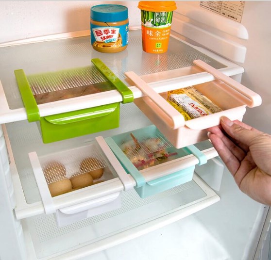 - Les mini-toboggans de type remorque permettent de stocker les bagatelles nécessaires, après avoir fixé l'appareil à l'étagère inférieure du réfrigérateur ou de l'armoire.