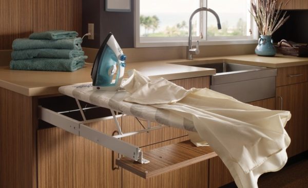 - Dans la cuisine sur le comptoir, vous pouvez installer la planche à repasser intégrée, ce qui est difficile à trouver dans un petit appartement. Il s'agit d'un excellent système intégré pour économiser de l'espace. Lorsque la planche est nécessaire, il suffit de la rallonger puis de la remettre.