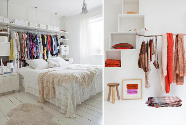 - S'il est impossible d'installer un placard dans une pièce, il vaut la peine d'utiliser des idées créatives telles que le stockage de vêtements sur des lianes suspendues au plafond et l'utilisation d'un porte-serviettes pour les ceintures, les foulards et les cravates.