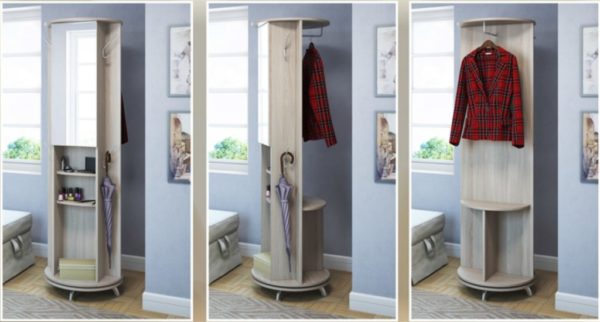 - Pour un petit couloir, vous pouvez envisager une idée de stockage aussi inhabituelle, comme une armoire rotative. Sur un miroir pleine longueur, et si vous le retournez, vous pouvez voir des étagères, des cintres et même un tableau blanc.