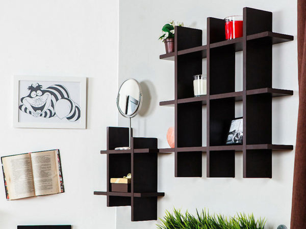 - Les étagères ouvertes à charnières ne gênent pas l'espace, elles peuvent donc stocker non seulement des cadres avec des photos et des souvenirs, mais aussi des choses plus importantes.