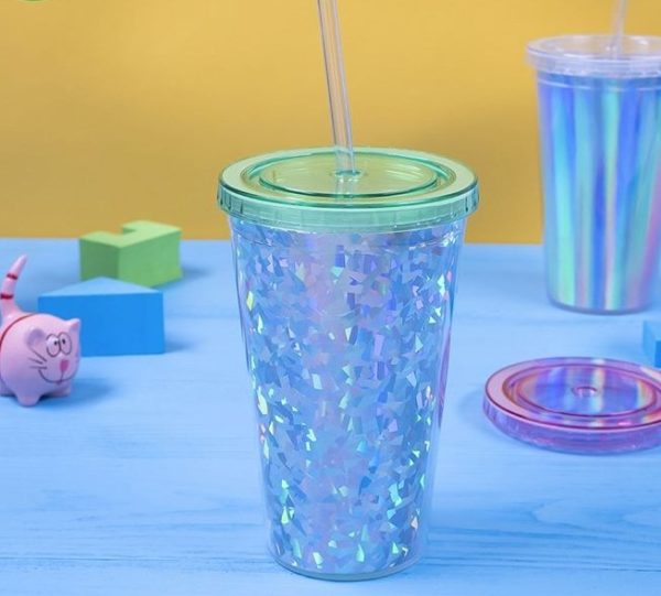 - Un verre avec une paille pour les boissons fraîches et autres avec un motif irisé brillant. Prix: 199 p.