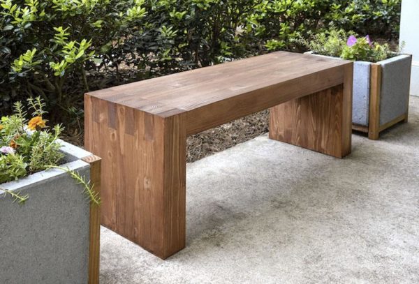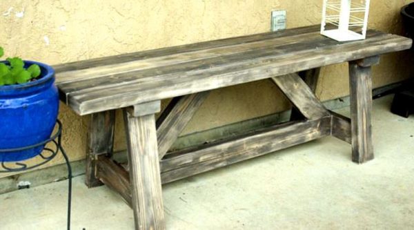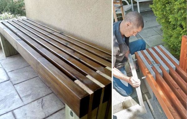 - Un simple banc en bois peut être inhabituel en raison de sa conception. Les couches de poutres de siège et de jambes alternent, créant une impression intéressante.