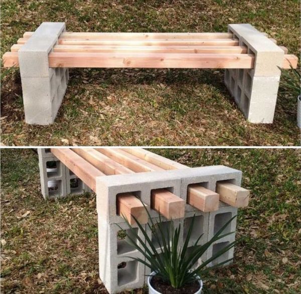 - Pour un design minimaliste concis de la cour, vous pouvez utiliser le banc, où la base sera en blocs de béton, et comme un endroit pour asseoir une planche de bois enduite de vernis.