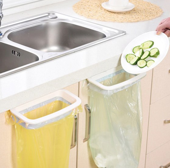 Pendant la cuisson, lorsque vous devez jeter quelque chose, il n'est pas pratique d'utiliser le bac à chaque fois. Dans un tel cas, il y a un support suspendu pour le sac, qui peut être accroché à côté de la zone de travail, et à la fin de la cuisson, jetez le sac à ordures dans le seau. Le coût n'est que de 100 roubles.