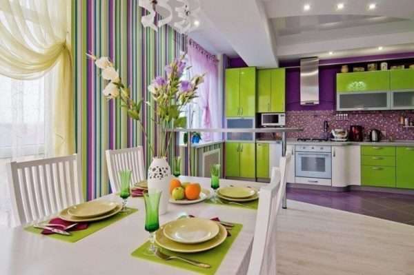 La seule couleur qui peut faire partie de l'intérieur de la cuisine à titre d'exception est le lilas ou le bleu. Ces nuances sont assez calmes et raisonnablement colorées.