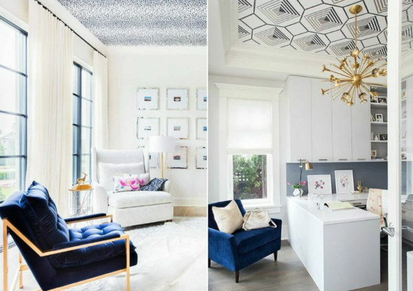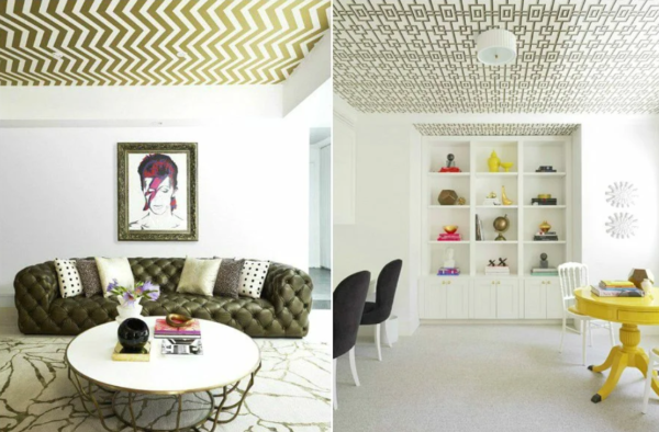 Si après réparation, il y a des surplus de papier peint, ils peuvent être utilisés pour décorer le plafond. C’est bien s’ils contiennent des motifs, des figures et des lignes élaborées. De tels dessins aideront à créer un accent attrayant sur le plafond et à lui donner un peu de zeste.