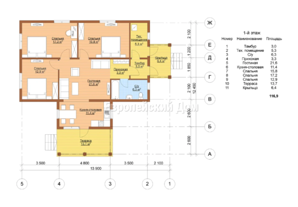 La superficie de la maison est de 116 mètres carrés. En entrant dans la maison, il atterrit immédiatement sur la terrasse, qui a une superficie de plus de 13 mètres carrés. De la terrasse on accède à un local technique, qui peut être aménagé en cellier pour ranger les choses. Après avoir passé la terrasse, vous vous retrouvez immédiatement dans la cuisine, qui peut être utilisée comme salon et salle à manger pour rencontrer des invités, ainsi que pour un dîner en famille. Dans la même pièce, vous pouvez placer une cuisine, une table à manger.