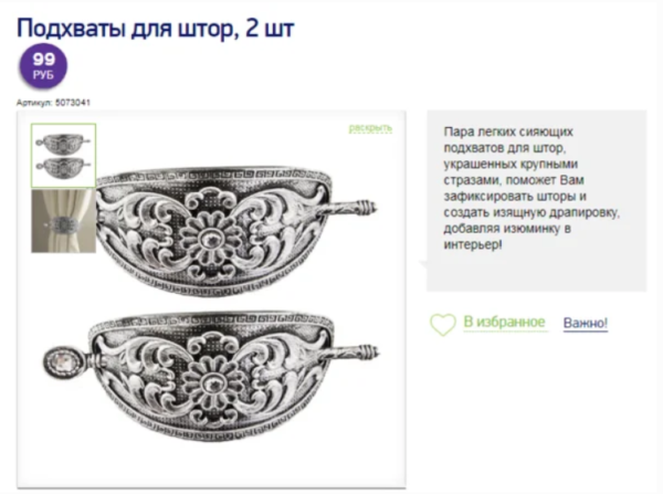 Poignées pour rideaux, à partir de 99 rub.