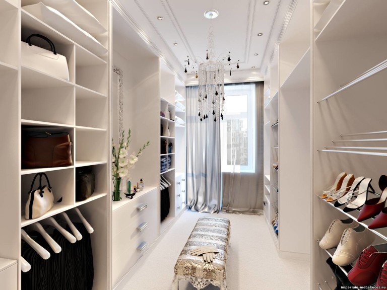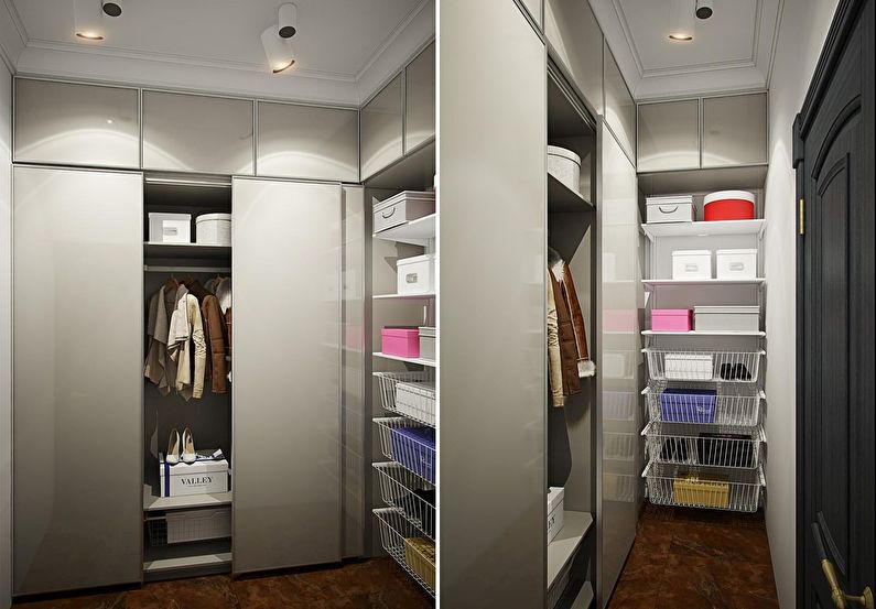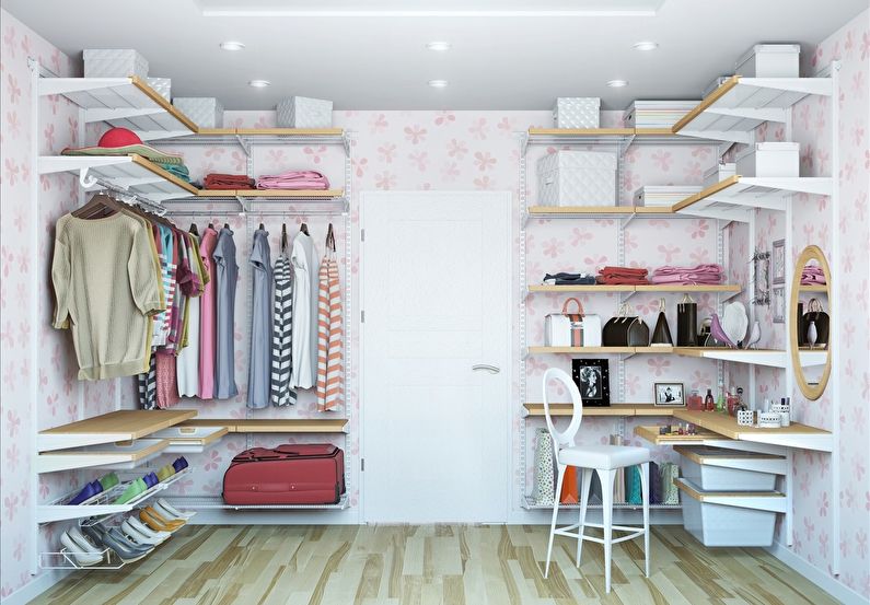 L'intérieur du dressing devrait allier fonctionnalité et esthétique. En effet, assez souvent pour une telle pièce une très petite pièce est allouée, et parfois une partie de la pièce, car l'espace ici doit être utilisé au maximum. Dans le même temps, l'attrait esthétique du dressing rend le séjour agréable, et pour le beau sexe, cela est d'une grande importance.