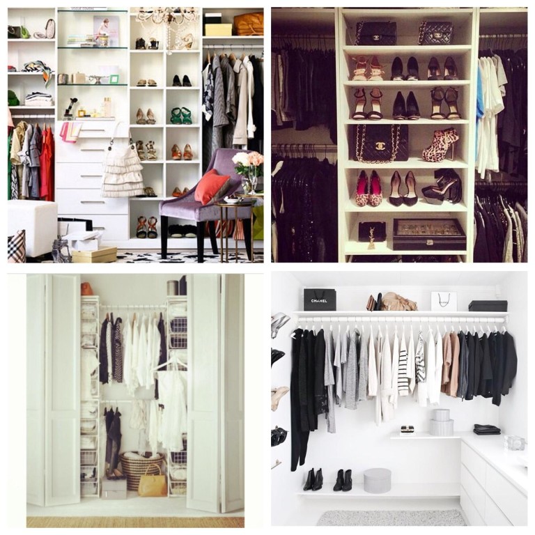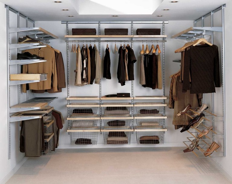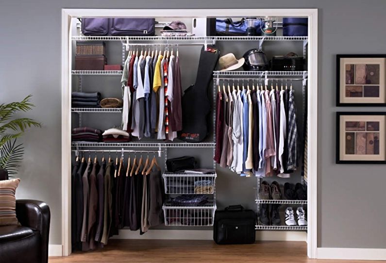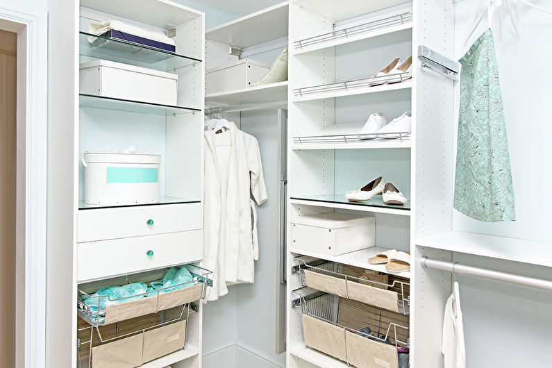 Dans un petit dressing, il suffit de placer uniquement des étagères, des crochets ou des cintres - un minimum nécessaire pour un rangement confortable des vêtements et des chaussures.