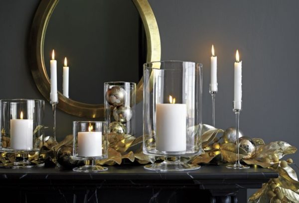 De belles bougies peuvent être placées sur la cheminée, il est recommandé de créer une composition de bougies de différentes tailles. Pour créer une atmosphère particulière, vous pouvez également utiliser des bougies parfumées à l'odeur d'aiguilles, d'agrumes ou d'épices.
