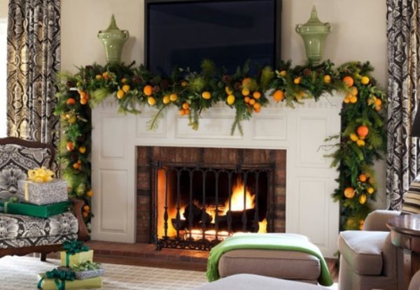 Les mandarins sont toujours associés au Nouvel An, ils peuvent donc également être utilisés pour décorer l'intérieur, y compris la cheminée. Il peut être disposé sur l'étagère supérieure de la cheminée ou placé dans un beau vase.
