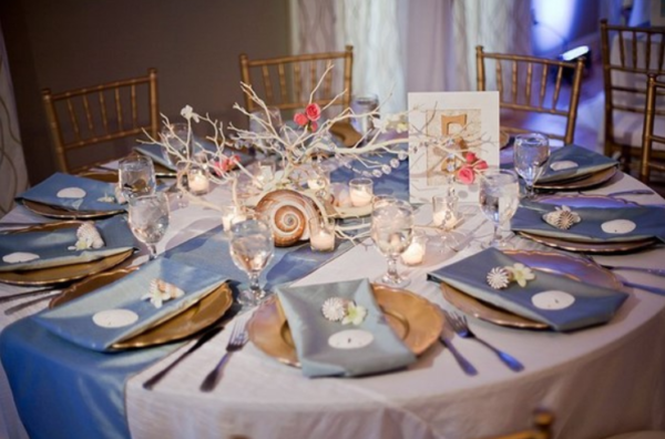 Des coquillages, des brindilles ressemblant à des coraux, du cristal, plusieurs accents roses et des serviettes bleu ciel sont l'ensemble parfait pour créer un look marin pour la table de fête. Grande conception de thème de thème.