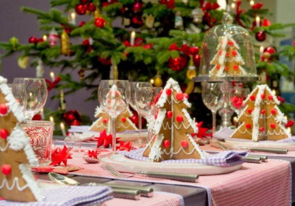 L'attirail le plus festif sur la table - mieux c'est. Il peut y avoir des biscuits au pain d'épice sous forme d'arbres de Noël, des boules de Noël ou des bonbons blancs et rouges sous la forme d'un bâton. Le fond peut être de délicates serviettes à carreaux ou une nappe blanche avec des motifs du Nouvel An.