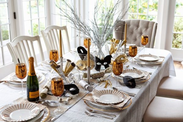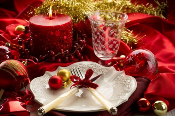 Les combinaisons peuvent être différentes - des bougies rouges, des guirlandes dorées ou simplement des boules de Noël pour la décoration dans ces couleurs. L'essentiel est de ne pas oublier les assiettes élégantes et les verres en cristal qui soutiennent leur style.