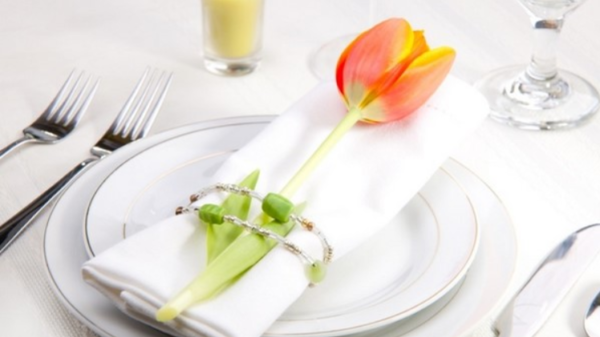 Le réglage de la table peut prendre en charge le thème floral d'ici le 8 mars. Sur un fond clair d'une nappe blanche bouillante et d'assiettes brillantes de la même couleur, vous pouvez laisser une fleur de tulipe attachée à une serviette blanche comme neige. Il n'est pas nécessaire de choisir des bourgeons de la même couleur, l'essentiel est qu'ils sont brillants et visibles.