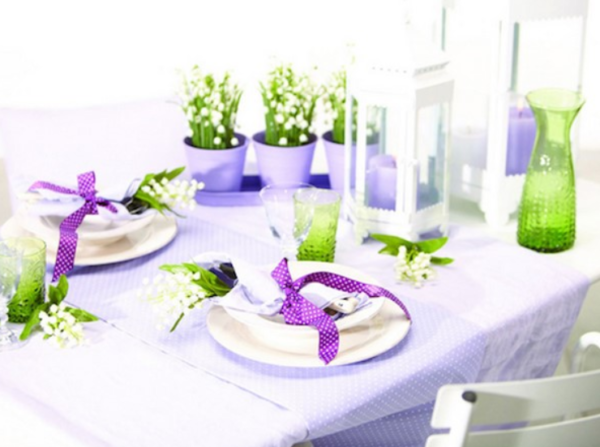 Par exemple, les branches de muguet dans des pots lilas qui peuvent être placés au centre de la composition ont l'air intéressantes et fraîches. Les serviettes peuvent soutenir le décor, si vous envelopper les mêmes fleurs et les attacher avec des rubans violets.