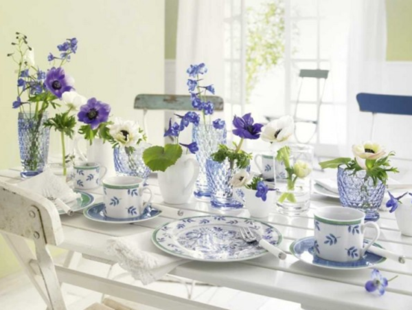 Si la maison a des assiettes avec des motifs blancs et bleus, elles peuvent elles-mêmes servir d'excellent décor de table. L'essentiel est de laisser un fond blanc, une nappe et des serviettes sur lesquelles ils se démarqueront. Vous pouvez compléter la composition avec des vases bleus avec des fleurs fraîches dans le ton.