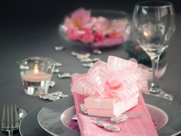 Le dîner pour deux ne doit pas être décoré en rouge, ni joncher la table de coeurs et de pétales de rose. Une nappe et des assiettes grises conviennent parfaitement à une soirée romantique. Et vous pouvez ajouter de la tendresse à la portion à l'aide de serviettes roses douces, de bougies et d'un joli cadeau de ton.