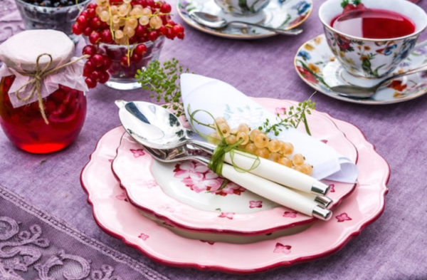 Pour des vacances à la maison en plein air, un service estival élégant avec des motifs floraux ou fruitiers est parfait.