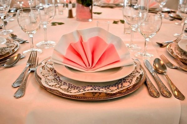 Le deuxième élément principal du service sont les serviettes. Ils peuvent maintenir la neutralité de la nappe ou être un élément central du décor.