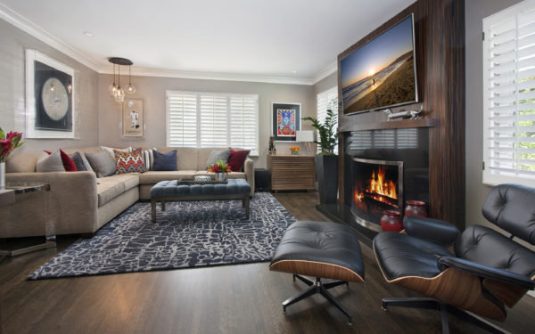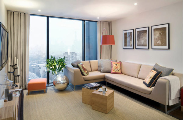 Un canapé d'angle s'intègre parfaitement dans une pièce rectangulaire.