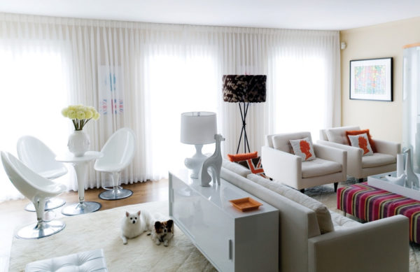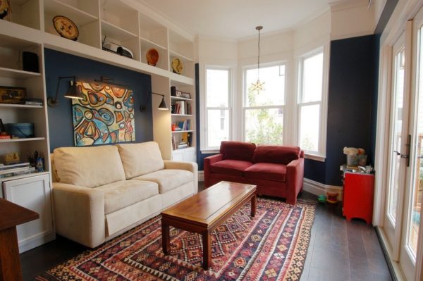- Si vous installez des chaises en face du canapé sur des murs opposés, nous enseignerons le décalage central et visuellement, la pièce prendra une forme rectangulaire.