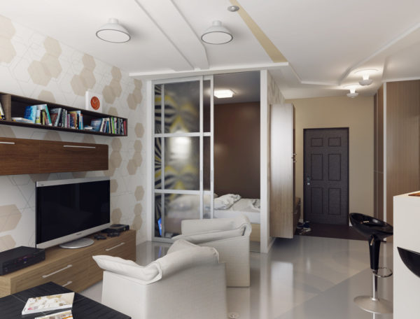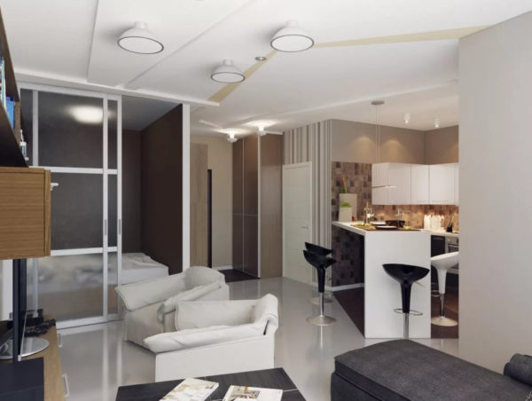 Le studio est en demande en 2019. La principale commodité d'une telle disposition est qu'en raison de l'espace ouvert, la pièce peut être divisée en plusieurs zones en utilisant les solutions innovantes les plus inattendues.