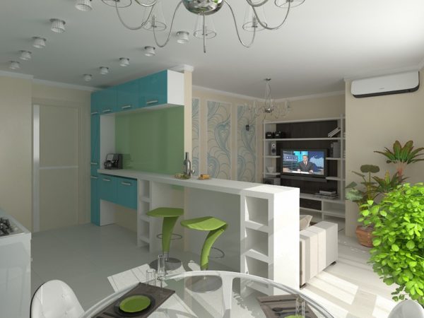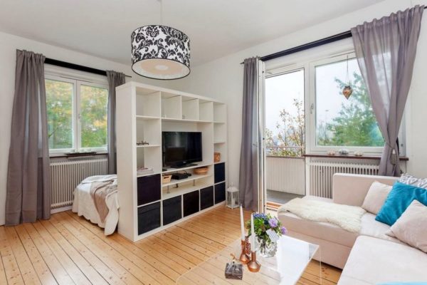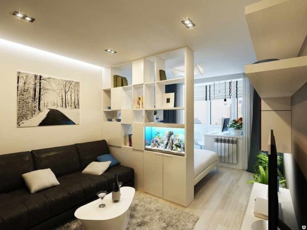 Le studio est en demande en 2019. La principale commodité d'une telle disposition est qu'en raison de l'espace ouvert, la pièce peut être divisée en plusieurs zones en utilisant les solutions innovantes les plus inattendues.
