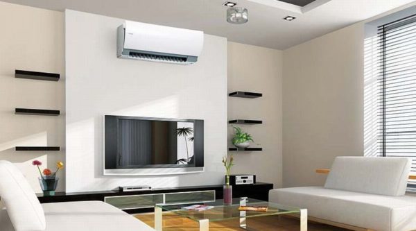Pour cacher le climatiseur afin qu'il ne gâche pas l'apparence de l'intérieur, vous pouvez l'installer sur le téléviseur. Cela est dû au fait que la vue principale est dirigée vers l'écran. Mais cela ne convient que si les deux appareils électroménagers sont de la même couleur. La meilleure option est le noir.