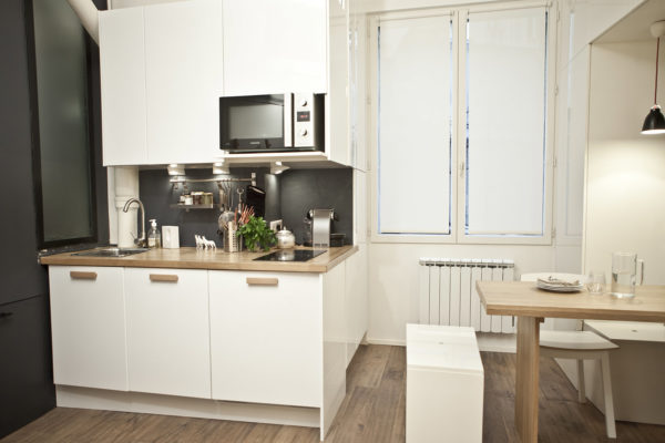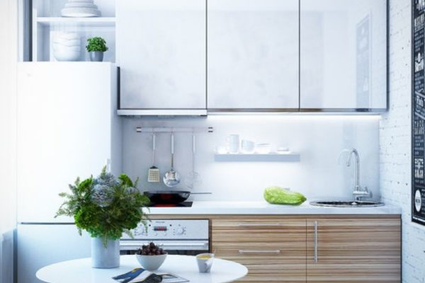 Vous pouvez organiser les meubles dans une petite cuisine de deux manières pratiques: linéaire ou angulaire. Dans le premier cas, les armoires sont situées sur l'un des murs de la pièce.