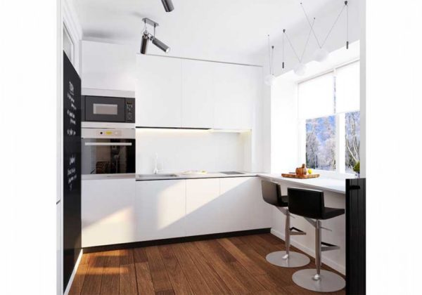 Vous pouvez organiser les meubles dans une petite cuisine de deux manières pratiques: linéaire ou angulaire. Dans le premier cas, les armoires sont situées sur l'un des murs de la pièce.