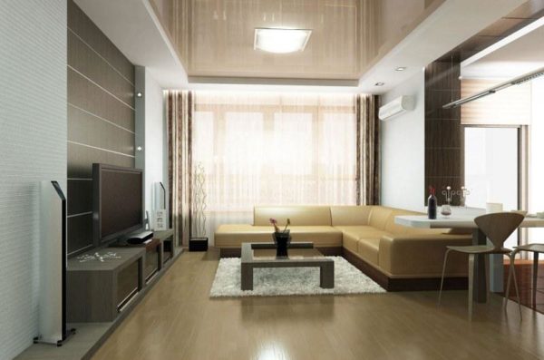 Si vous ne pouvez pas visuellement augmenter le plafond lui-même, vous pouvez rendre le sol brillant. Les carreaux brillants ou le bois laqué conviennent à la décoration. Lors du choix d'une couleur, il est préférable de privilégier les nuances claires.