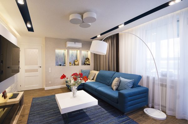 - les plafonds tendus à deux ou trois niveaux voleront de l'espace, mais l'effet visuel sera complètement opposé. Surtout si vous abaissez le périmètre du plafond et utilisez un matériau brillant pour terminer la partie centrale;