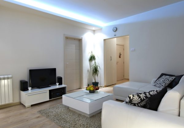 - les cloisons sèches conviennent également aux plafonds bas. Dans la toile, vous devez faire une cavité et la peindre dans une couleur plus foncée.