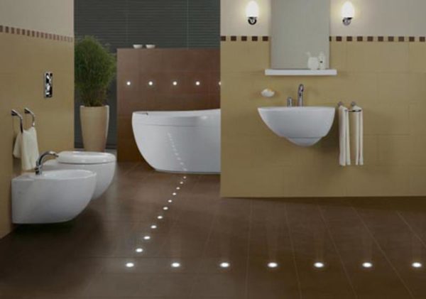 Au sol, les spots sont installés dans des trous spécialement créés dans le stratifié ou dans les carreaux de sol. Les lampadaires sont plus résistants aux chocs et étanches à l'air. Ils n'ont pas peur du jet d'eau projeté hors du bain et de la vapeur chaude. Et après une dure journée, se détendre dans le jacuzzi de la salle de bain équipée d'un éclairage au sol doux et apaisant est un vrai bonheur.