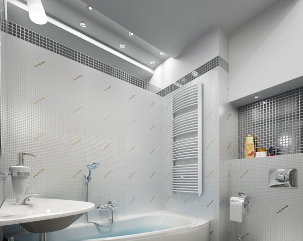 Pour les petites baignoires d'une superficie totale de trois mètres carrés, un spot situé au centre du plafond suffit. Si le plafond tendu est blanc brillant, cette lumière suffira avec une surabondance dans tous les coins et recoins.