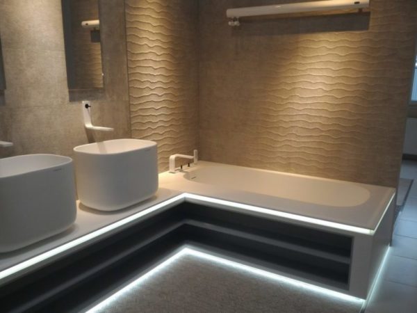 - L'éclairage dans le jacuzzi ou la douche est facultatif, mais s'il est disponible, il créera une atmosphère romantique et intime. L'espace jacuzzi dans la salle de bain doit au contraire être éclairé par une lumière romantique faible et tamisée, qui créera une atmosphère relaxante. L'éclairage du podium est superbe, si cela est prévu par la conception.