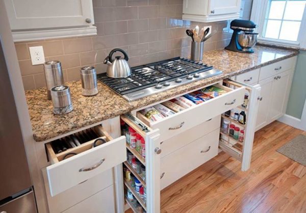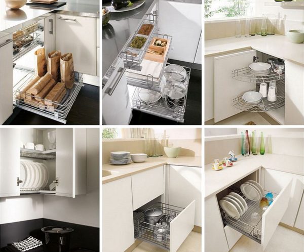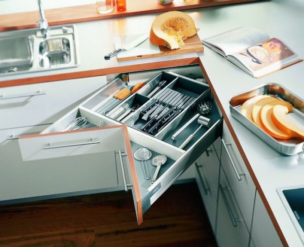 Si vous équipez l'espace de rangement pour la vaisselle avec divers tiroirs, séparateurs de couverts, vous pouvez utiliser rationnellement et intensivement chaque centimètre de l'espace de la cuisine.