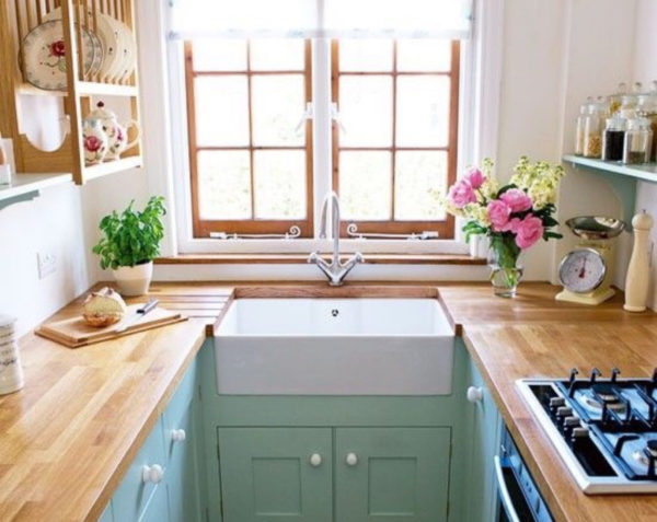 Lorsque vous concevez une petite cuisine, elle s'appuiera correctement sur des couleurs claires et leurs nuances. Le blanc, la pêche, la crème, le beige, l'olive aideront à agrandir et à donner de la légèreté à la zone modeste de la cuisine.