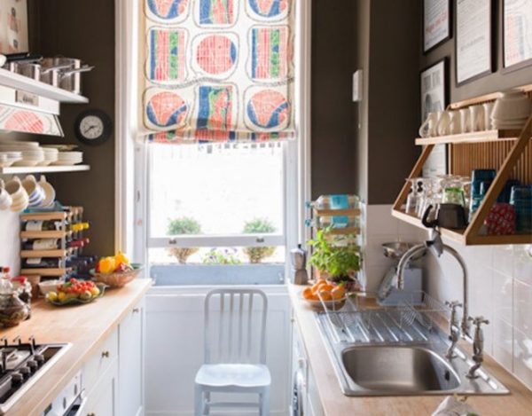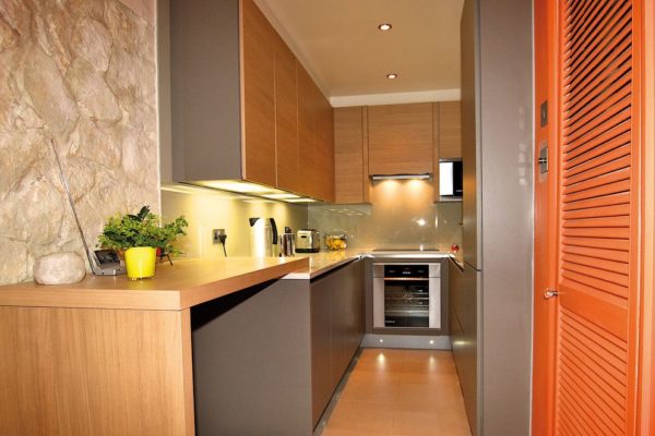 Une suite conçue pour une très petite cuisine doit être étroite, haute et spacieuse. Un grand nombre d'armoires suspendues créeront des coins pour stocker toutes sortes de gadgets nécessaires.