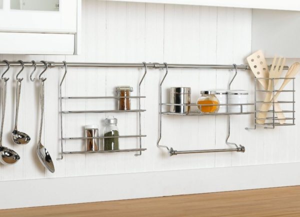 Un attribut irremplaçable d'une cuisine moderne est attaché au-dessus du comptoir - balustrade, sur lequel des louches, des louches, des écumoires et d'autres ustensiles sont placés avec des crochets.