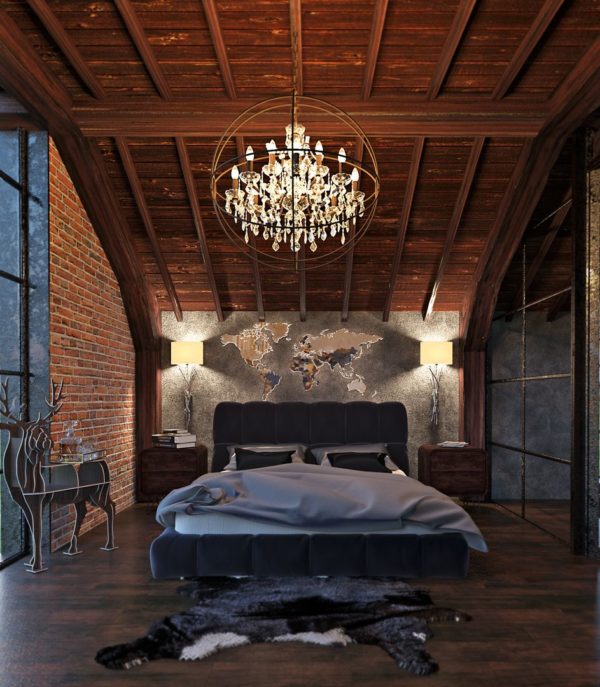 Le style country-loft manque de métal, de chrome et de verre. Son esthétique particulière est soulignée par l'illusion délibérée de bois non traité, de briques primitives, non peintes ou polies, et même dans les lampes des tables de chevet en bois, il n'y a ni métal ni verre, mais seulement une lumière douce et du bois.
