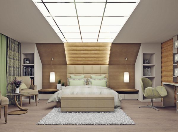 Une lampe moderne en verre et en métal peut être remplacée par des lampes de table confortables sur les tables de chevet, et la fenêtre du plafond donne suffisamment de lumière pendant la journée pour une table sur laquelle vous pouvez manger et travailler.