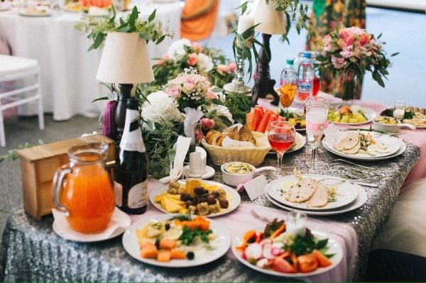 A la table ronde, les boissons et les fleurs sont placées au centre, tout le reste se trouve autour d'eux. Cela vaut la peine de considérer strictement le montant prévu pour qu'il soit suffisant pour toutes les personnes présentes, et vous n'avez pas à le ramener de la cuisine ou à hausser les mains coupables devant les démunis.